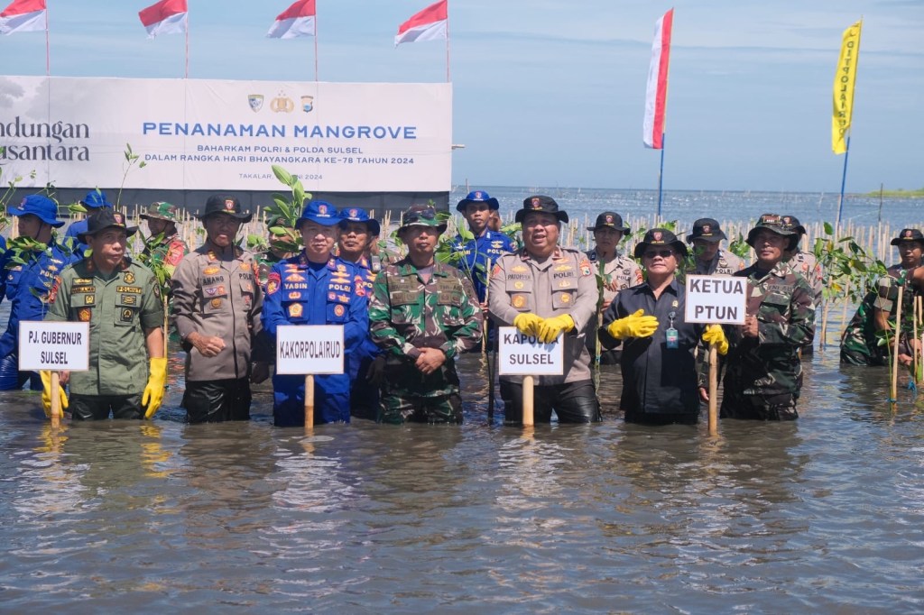 Kakorpolairud Baharkam Polri Irjen Pol M. Yassin Kosasih, S.I.K., M.Si., M.Tr.Opsla memimpin acara Bakti Sosial Penanaman Pohon Mangrove dalam rangka Hari Ulang Tahun (HUT) Bhayangkara ke-78 dan Rakernis Baharkam Polri di Pantai Takalar, Parialau Kabupaten Takalar, Selasa (04/06/24).