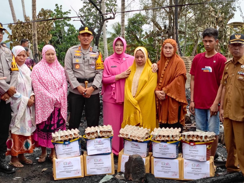 Wujud empati,Kapolres Soppeng AKBP Dr H.Muhammad Yusuf Usman SH.,SIK.,MT.,CIPA di dampingi Ketua Bhayangkari Cabang Soppeng Ny.Denny Yusuf menyerahkan bantuan sosial dan tali asih kepada korban musibah kebakaran yang melanda lima rumah warga penrie Desa Barang Kecamatan Liliriaja,Senin 14 Oktober 2024.