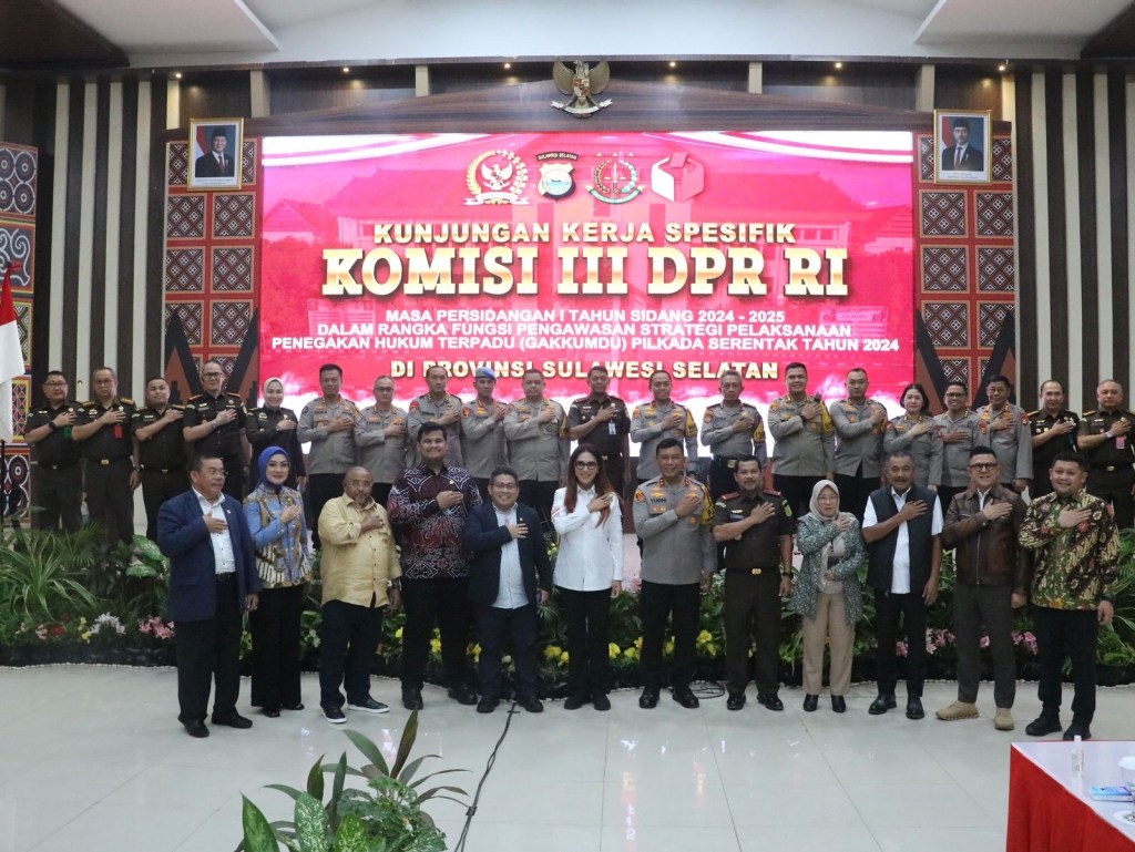 Komisi III DPR RI melakukan kunjungan kerja spesifik ke Provinsi Sulawesi Selatan Masa Persidangan I Tahun Sidang 2024-2025 Dalam Rangka Fungsi Pengawasan Strategi Pelaksanaan Penegakan Hukum Terpadu (Gakkumdu) Pilkada Serentak Tahun 2024. Kegiatan ini berlangsung di Aula Mappauodang Mapolda Sulsel, Kamis (31/10/24).