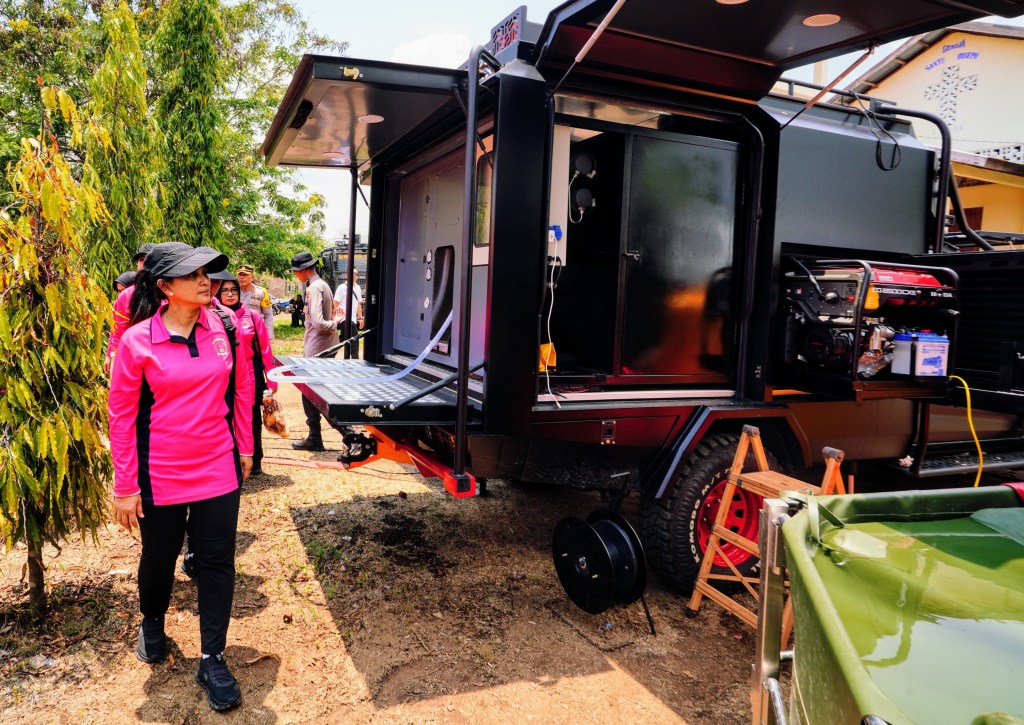 Flores Timur, 14 November 2024 — Ketua Umum Bhayangkari, Ny. Juliati Sigit Prabowo, meninjau langsung proses penyaluran air bersih bagi para pengungsi korban erupsi Gunung Lewotobi Laki-laki yang ditempatkan di Posko Pengungsian Kobasoma, Desa Kobasoma, Kecamatan Titehena, Kabupaten Flores Timur. Air bersih yang sangat dibutuhkan ini disalurkan melalui kendaraan water treatment yang dioperasikan oleh Brimob Polda NTT.