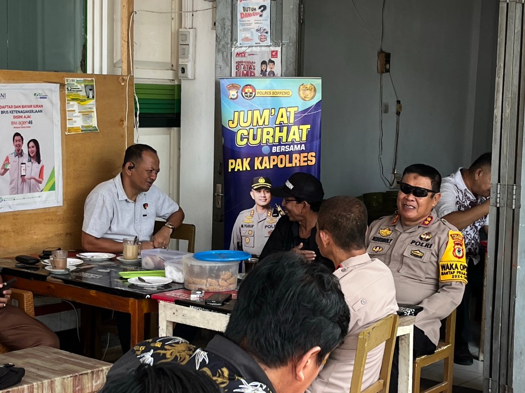 Dalam rangka Cooling System pasca Pilkada 2024 Polres Soppeng menggelar Jumat curhat bersama warga masyarakat kelurahan Lemba Kecamatan Lalabata Kab.soppeng serta pengunjung Warkop bertempat di Warkop Sejahtera mandiri Jln.Kemakmuran Watansoppeng.Jumat 13/12/ 2024