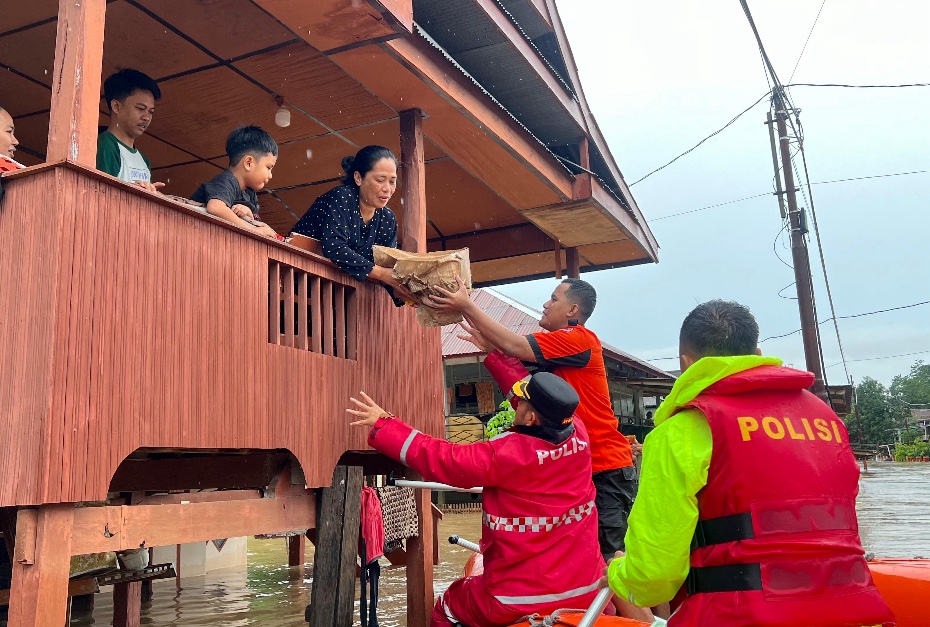 Dengan menggunakan perahu karet Kapolres Soppeng bersama personel dan BPBD menyasar rumah warga yang terjebak banjir dan kemudian memberikan Bantuan Sembako kepada warga setempat.