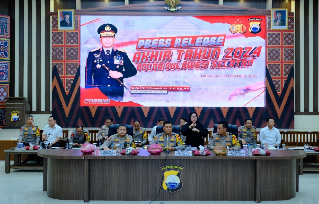 Polda Sulawesi Selatan (Sulsel) menggelar Press Release akhir tahun untuk menyampaikan capaian kinerja, evaluasi, dan keberhasilan selama tahun 2024. Acara yang berlangsung di Aula Mappaodang Mapolda Sulsel ini dipimpin langsung oleh Kapolda Sulsel, Irjen Pol. Yudhiawan S.H., S.I.K., M.H., M.Si, didampingi Irwasda Kombes Pol. Ai Afriandi, Kabid Humas Kombes Pol. Didik Supranoto, dan pejabat utama lainnya.